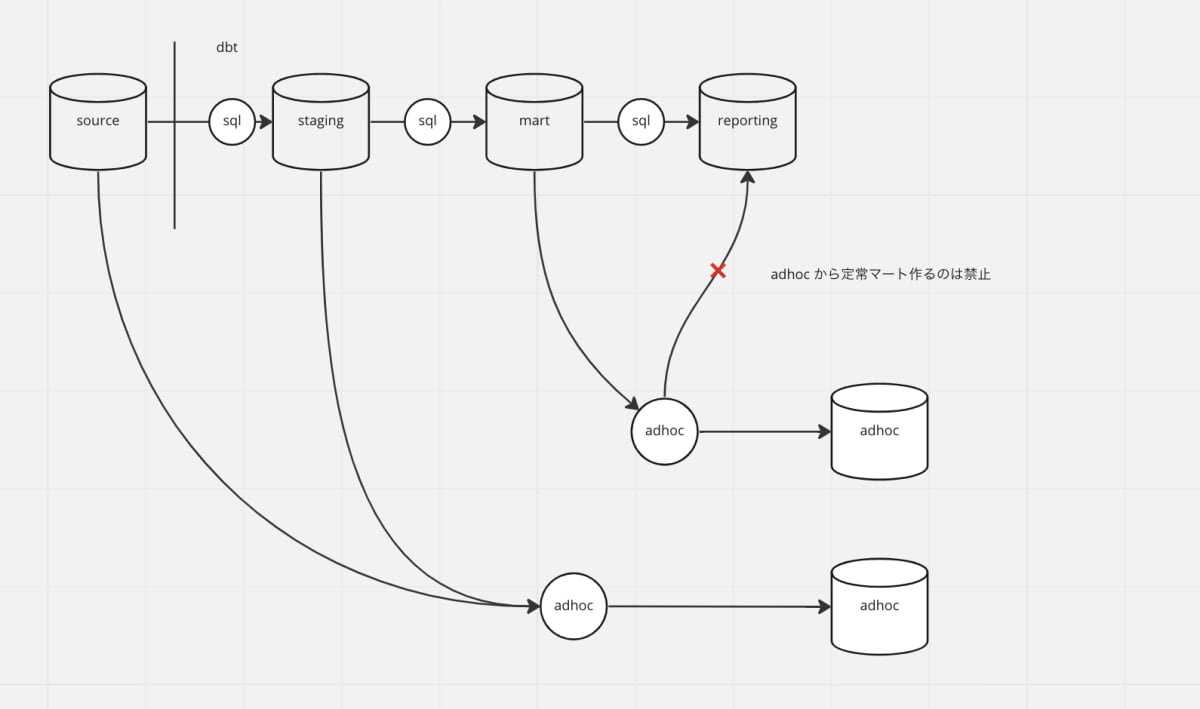 品質の位置付けを分けるために、adhoc の view とそうでないテーブルは一方通行としました。