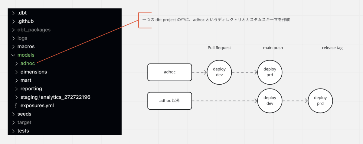 通常は main push で dev 環境へのデプロイ、release tag で prd 環境へのデプロイとするところ、adhoc クエリのみ main push で prd 環境へのデプロイとしました。