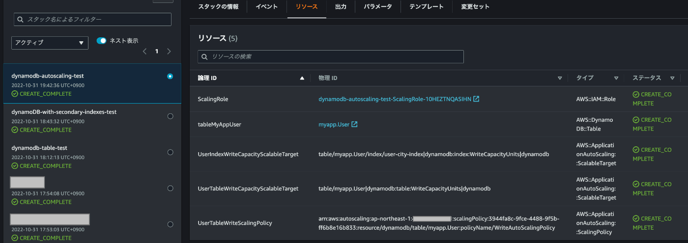 DynamoDBコンソールに移動すると無事2つのスタックから2つのテーブルが作成されています。