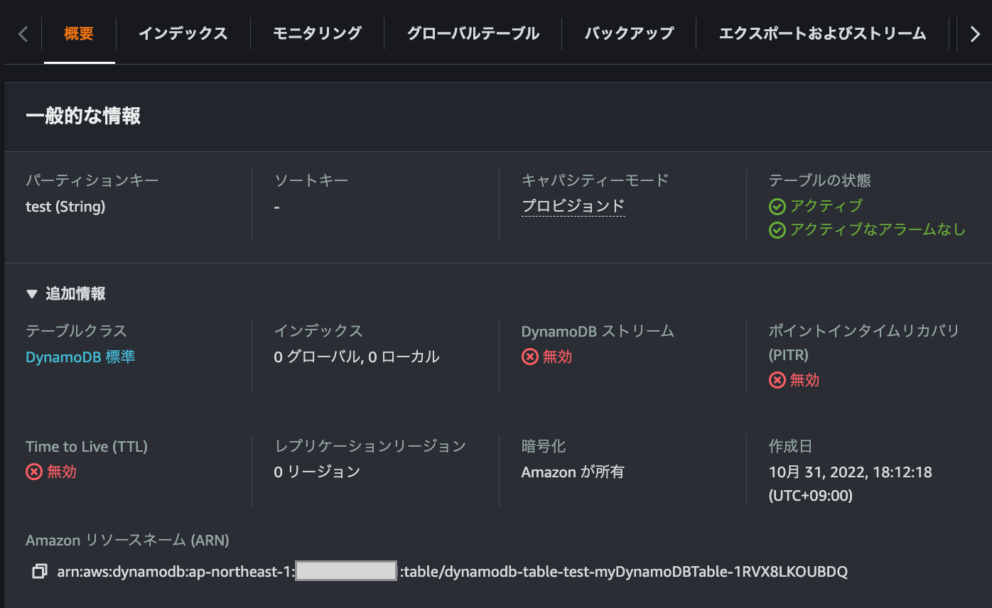 Value: !Ref myDynamoDBTable # AWS::DynamoDB::TableをRefするとテーブル名が返る。