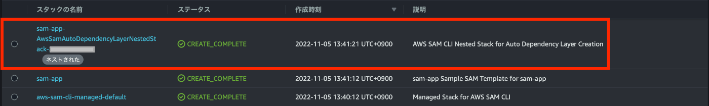 でスタックを作成した時には存在しなかった「sam-app-AwsSamAutoDependencyLayerNestedStack-xxxxxxxxxxxx」スタックが作成されています。
