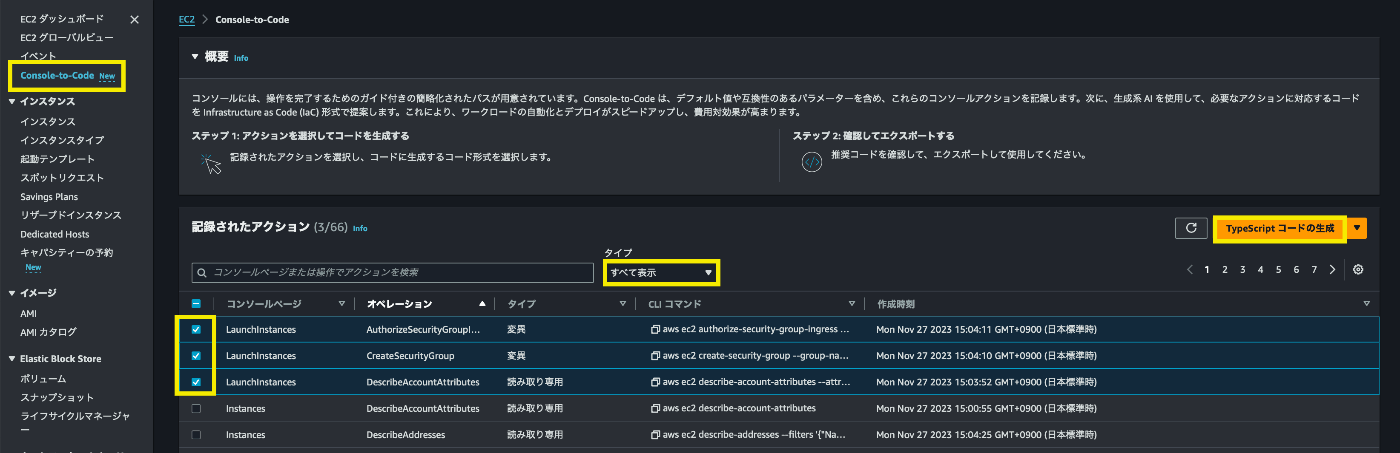 Console-to-Code画面に戻り、「タイプ」を「すべてを表示」にすると、アクションが表示されました。LaunchInstance(インスタンス起動)コンソールでのアクションと書いてあるものを選択して「Typscriptコードの生成」をクリックします。(この時点で"CLIコマンド"列にコマンドが存在。)