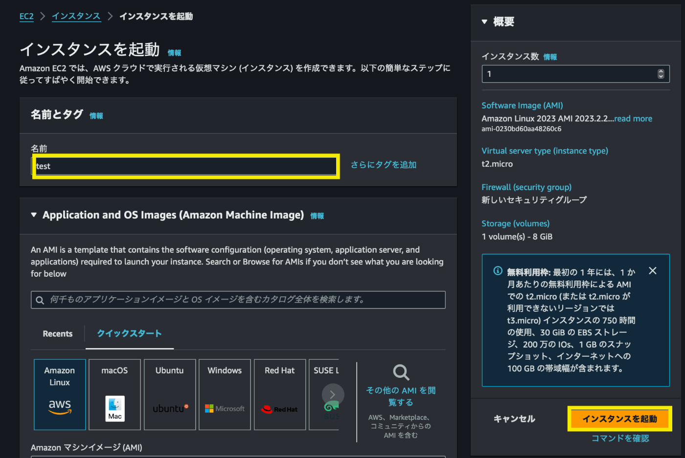 試しにtestという名前でインスタンスを作成してみます。