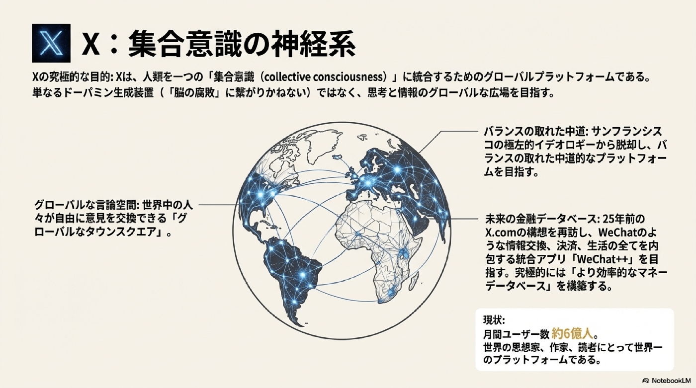 - 集合意識の実現: Musk氏は、Xを単なるドーパミン生成ストリーム(「脳の腐敗」につながる可能性がある)ではなく、人類の「集合意識」に可能な限り近づけるグローバルプラットフォームにしたいと考えています。これは、自動翻訳機能を通じて、世界中の異なる言語グループの人々の思考を結びつけることで、宇宙の性質に対する理解を深めるためです。
