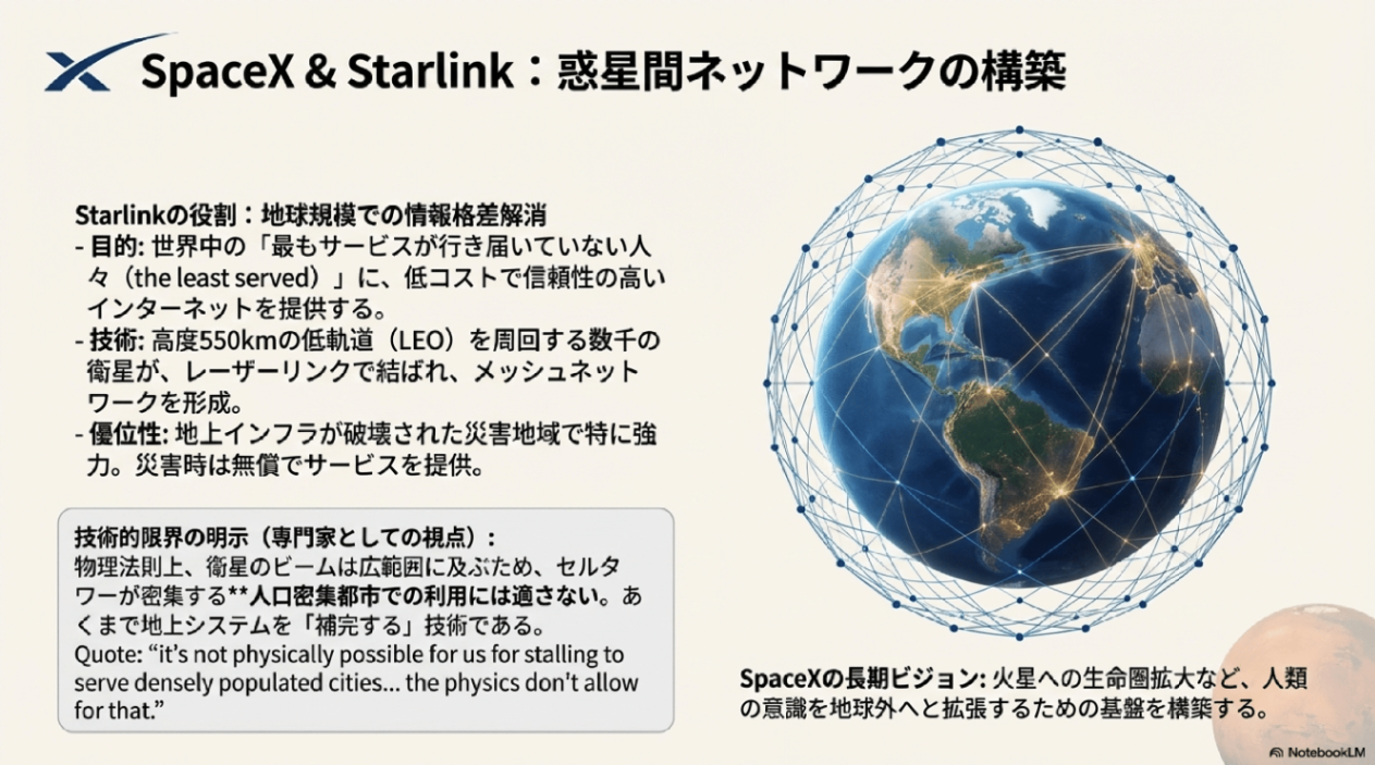 - Starlinkの限界: Starlinkは地上の携帯電話システムを補完するものであり、ビームの物理的特性上、人口密度の低い農村地域で最も効果を発揮します。衛星が遠すぎる(550km)ため、タワーが1kmごとにある都市部で地上システムと効率的に競合することは、物理的に不可能です。