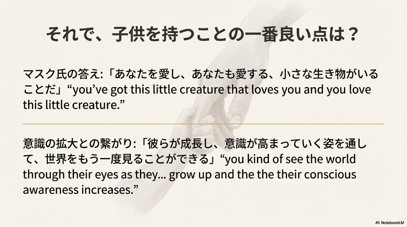 - 子育てと人口減少: Musk氏は、人類の意識を拡大するためには、人間の数が減るのは好ましくなく、人口減少を大きな問題として懸念しています。人類が存続するためには「根本的に子供を持つ必要がある」と述べています。