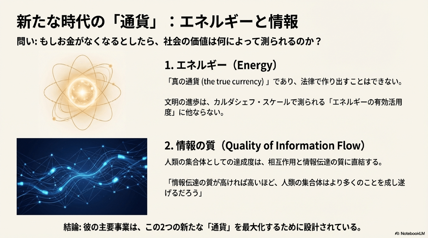 - 真の通貨はエネルギー: お金が労働配分の情報システムであるのに対し、真の通貨は物理学に基づいたエネルギーであり、文明の進歩はカルダシェフ・スケール(Kardashev scale)におけるエネルギー活用度で測られるとしています。