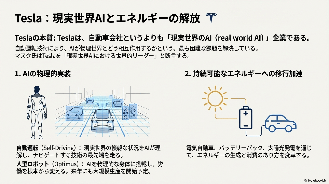 - 投資: Musk氏は、自身が投資家ではなく建設者であると強調し、株式をあまり買わないとしています。もし投資するならば、AIとロボティクス、そして宇宙飛行を行う企業が将来的に価値のほとんどすべてを占めるだろうと述べ、GoogleとNvidiaを挙げました。