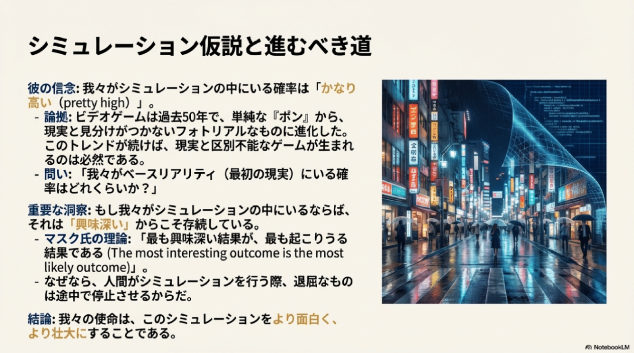 - シミュレーション仮説: 私たちがシミュレーションの中にいる確率は非常に高いと考えています。文明が継続すれば、未来のビデオゲームは現実と区別がつかなくなり、非常に洗練されたAIキャラクターが登場するだろうという理由に基づいています。Musk氏は、シミュレーションの外側よりも内側の方が興味深い可能性が高く、最も興味深い結果が最も起こりやすい結果であるという理論を持っています。