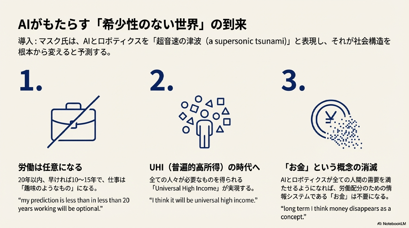 - Universal High Income (UHI): この未来では、人々は「Universal Basic Income (UBI)」ではなく、「Universal High Income (UHI)」(普遍的高所得)を得ることになるだろうと述べています。AIとロボティクスが人類のニーズをすべて満たせるほど巨大になれば、人間が思いつくあらゆる商品やサービスが手に入るようになり、お金の概念自体が長期的に消滅する可能性が高いと語っています。