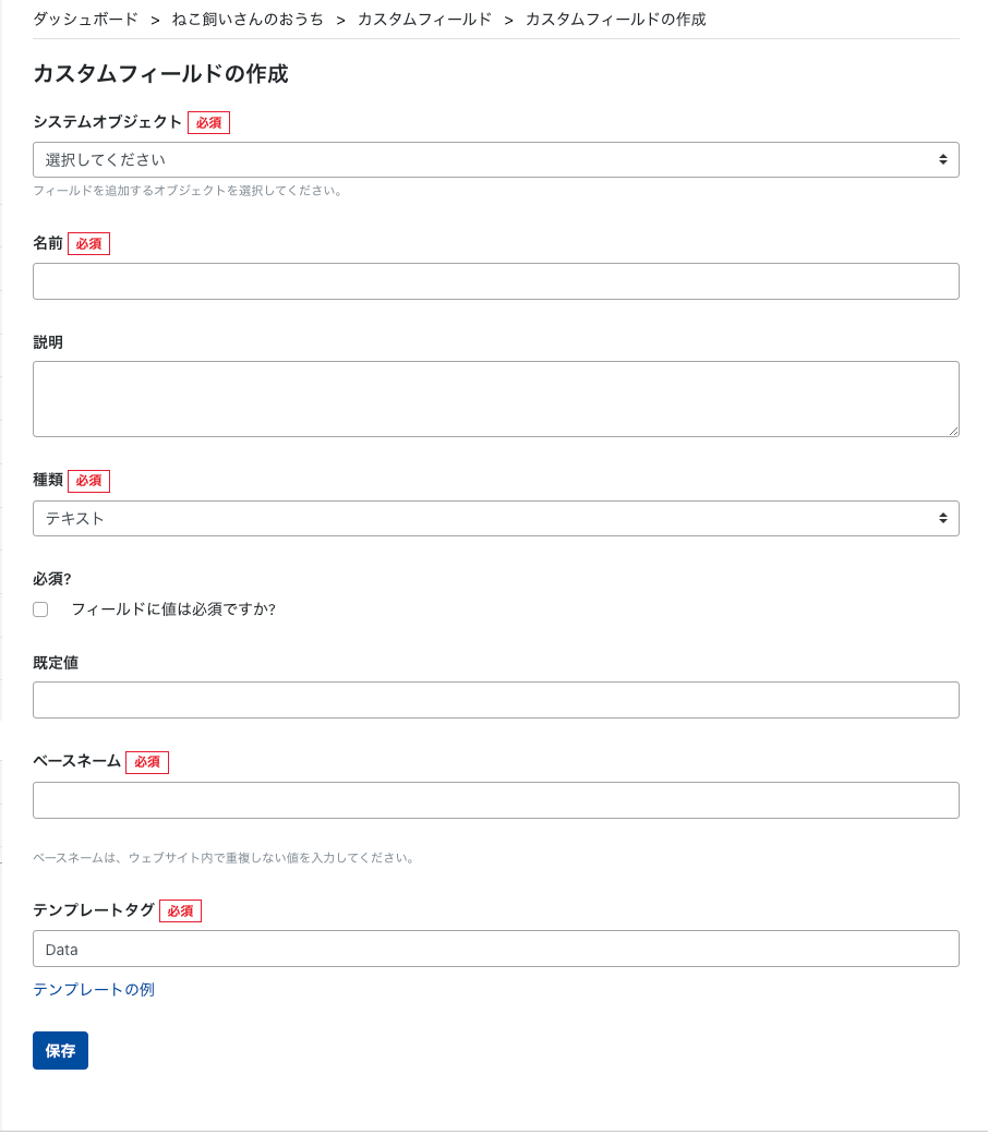 - カスタムフィールド > 新規 からカスタムフィールドを新規作成