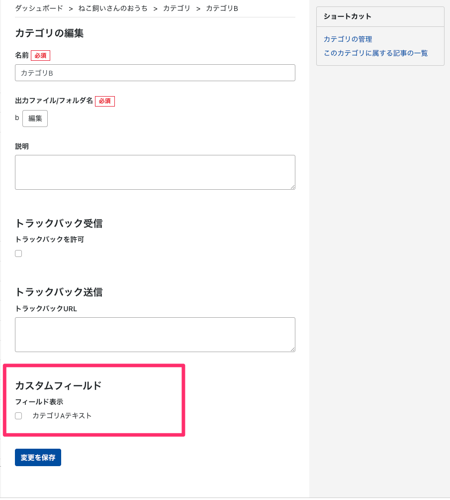 (こちらにチェックを入れることで、カスタムフィールド側のカテゴリエリアにもチェックされることを確認)