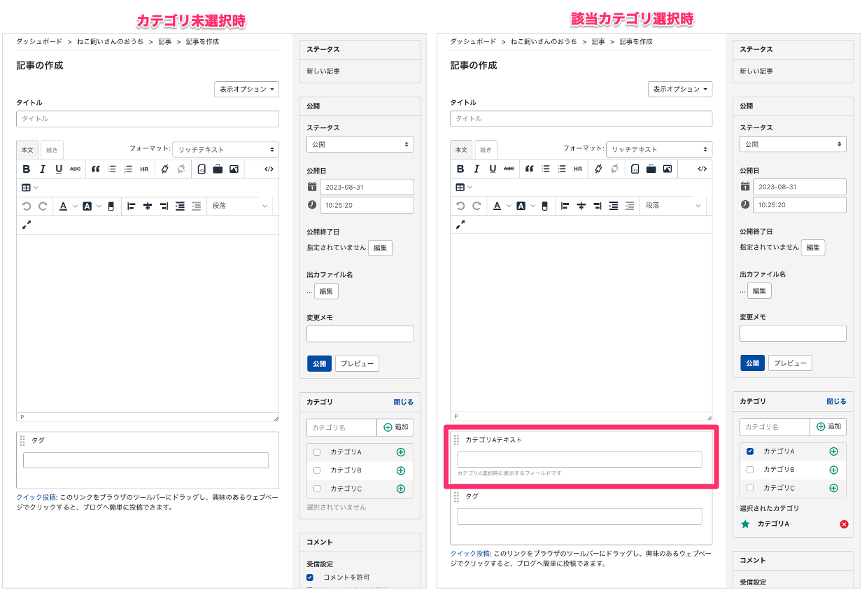 4. 記事の新規作成画面から該当のカテゴリを選択 → 紐づくカスタムフィールドが表示される