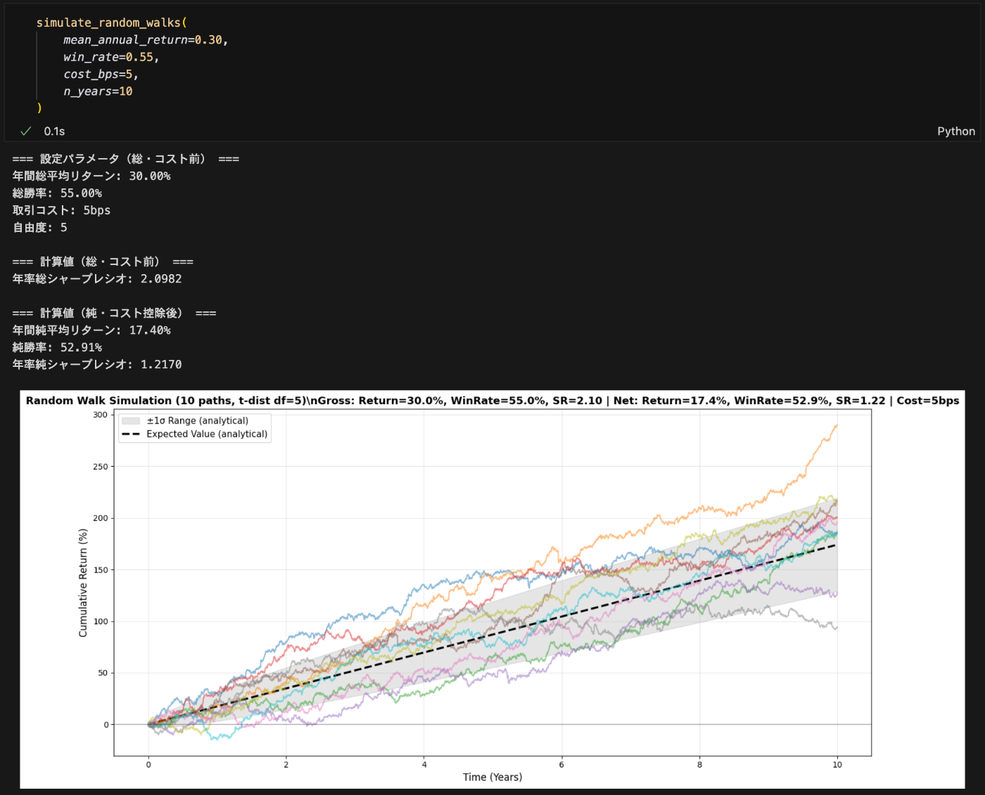 - 10年間の資産推移シミュレーション機能の実装:simulate_random_walks関数で10本のランダムウォークを生成し、解析的な1σ範囲(確率的な上下限)を重ねて表示する機能を実装。手数料(bps)を考慮した現実的なシミュレーションを可能にした。