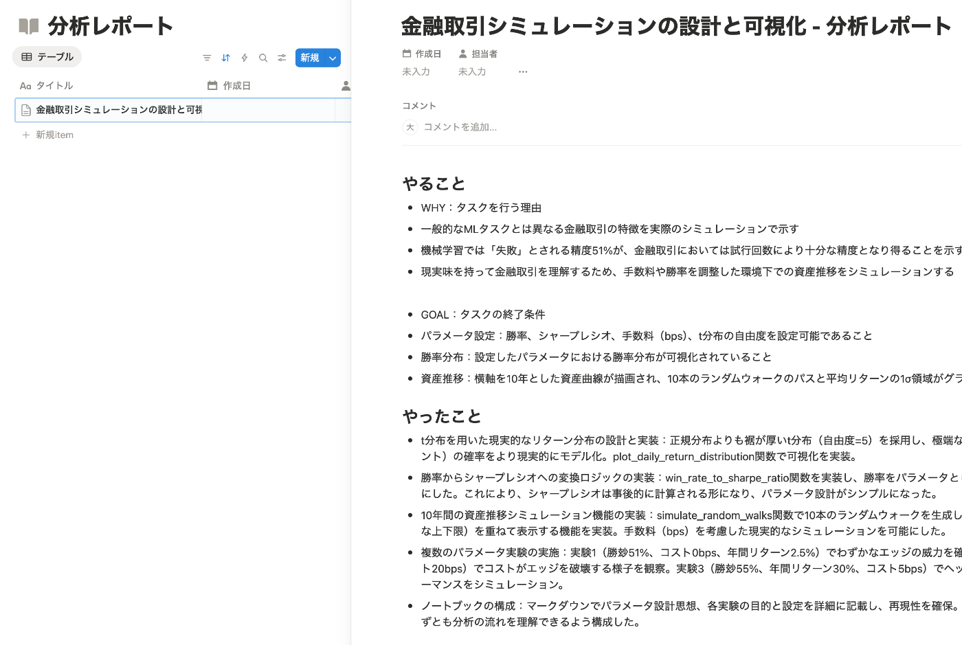 ここまで、ちょっとした金融シミュレーションの分析チケット、Notebookを用意し、それをClaude Code × Notion Remote MCPを経由して分析レポートDBにレポートを自動生成するという流れを一通り試してみました。