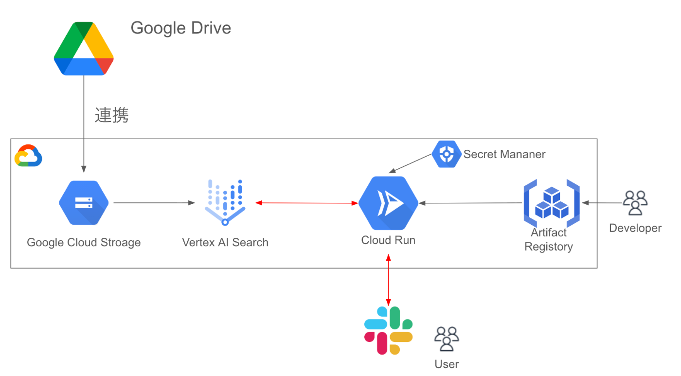 - Google CloudのVertex AI Searchを中心に構築しました。Vertex AI SearchはGoogle Driveとの相性が良いだけでなく、RAG検索の機能が充実していることから採用しました。