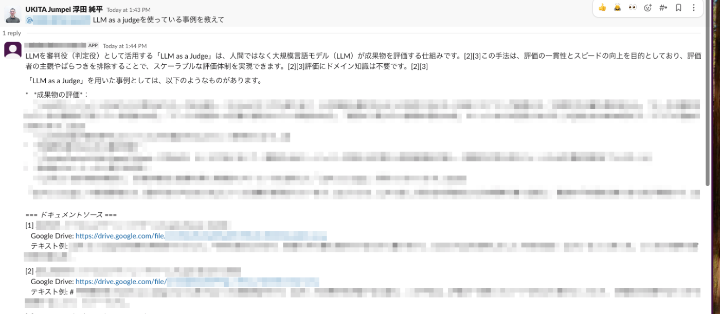 そこで、Google Drive上にあるプロジェクトの資料 (定例会議の資料、最終資料など) をソースとして、社内プロジェクトをSlackから対話的に検索できるボットを作り、社内のユーザに展開しました。