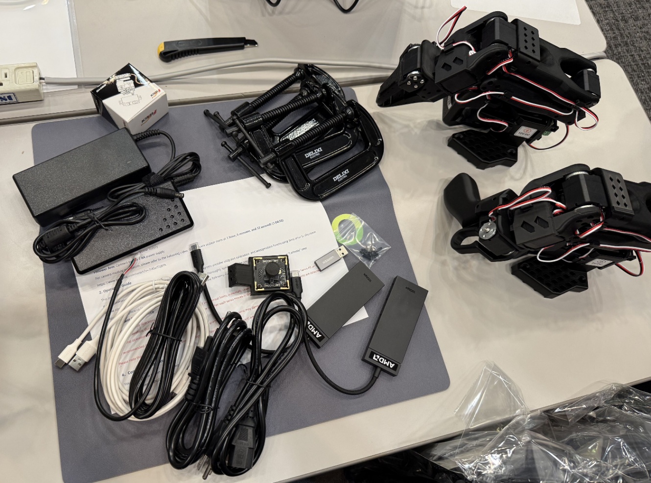 開始時間になると,WowRobo Robotics社から提供されているSO-101の組立済キットが配布されました.SO-101アームだけではなくUSBカメラやUSBハブ,アーム固定用のクランプが入っていました.これさえあればすぐにタスクに取り掛かれる充実のセット内容ですね!