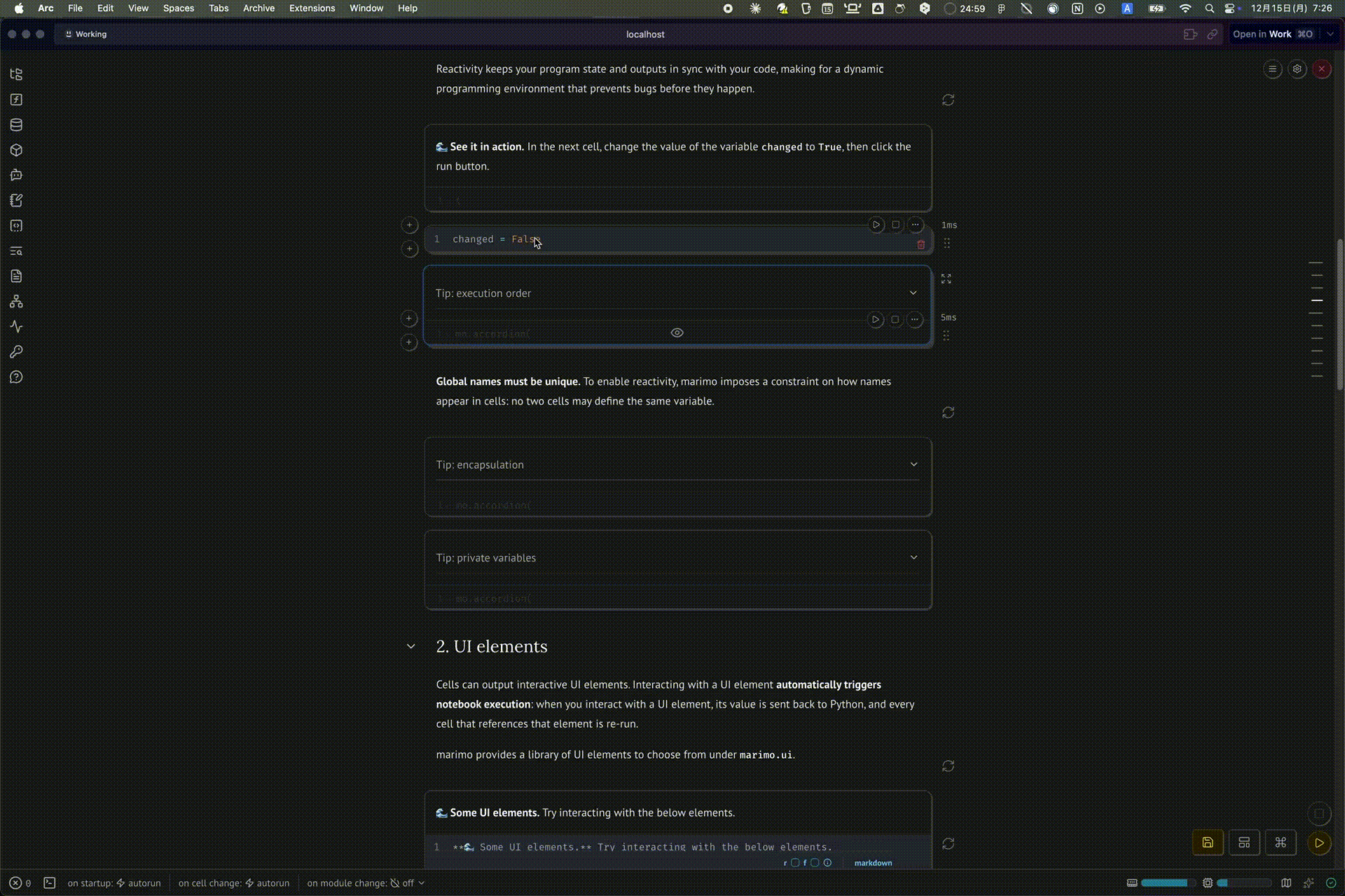 チュートリアルを試してみたところ、リアクティブな実行とインタラクティブなUIが印象的でした。セルを変更すると依存するセルが自動で再実行され、それでいて.pyファイルとして扱える点が非常に良いと感じました。