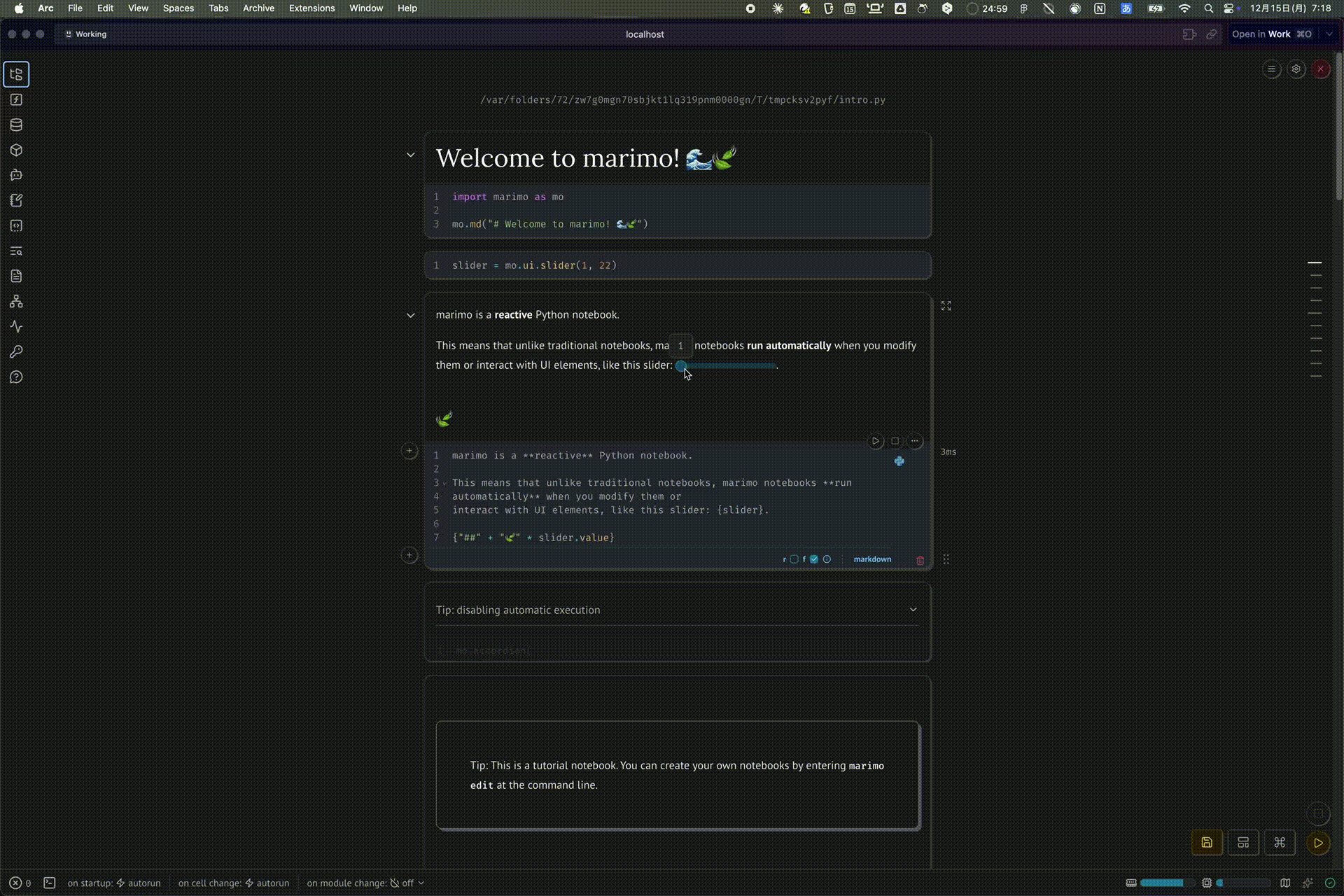 上記コマンドでチュートリアルを開始でき、ブラウザ上でmarimoのUIが立ち上がります。
