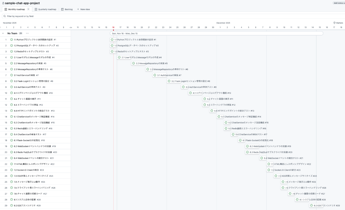 続いて、ドキュメントで生成したタスクをGitHubのissuesに登録します。AIコーディングツールで、以下のようなプロンプトで指示します。