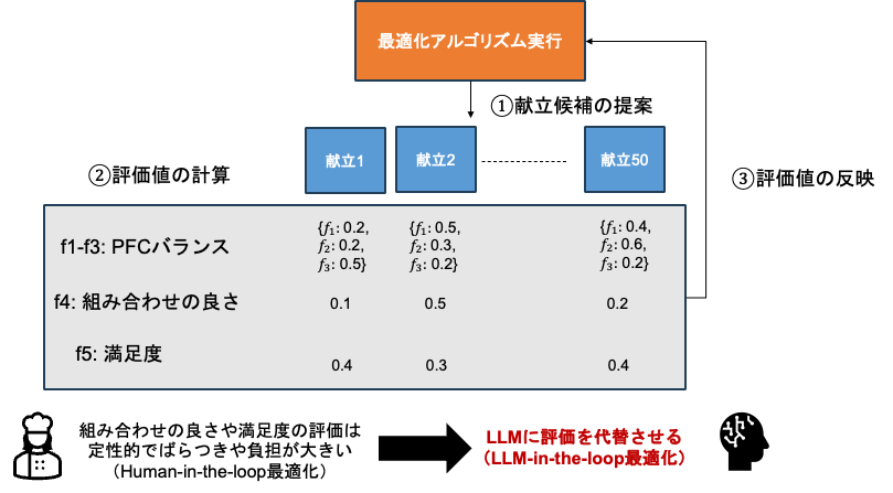 具体的には、①献立候補の提案→②評価値の計算→③評価値の反映という最適化フローにおいて、②評価値の計算における定量的な評価を最適化アルゴリズムで行い、定性的な評価をLLMによって自動化する仕組みを提案します。