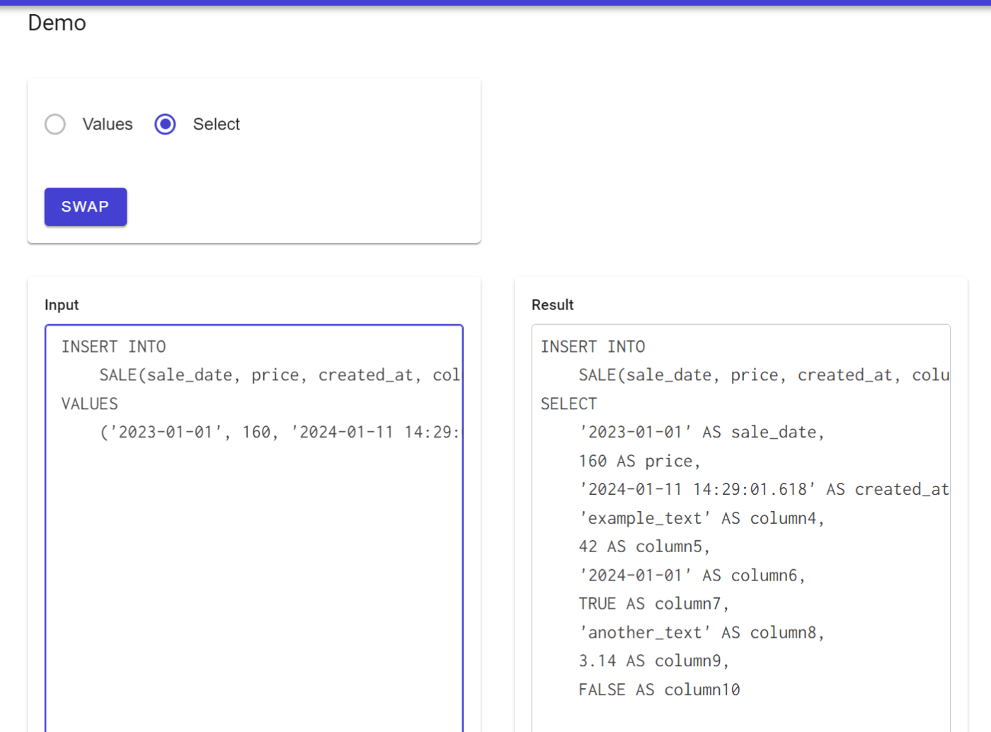 SELECTクエリ形式を使ってもいいし、VALUESクエリ形式に戻して使っていいです。