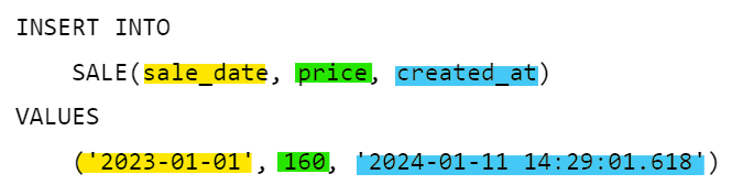 SALE(sale_date, price, created_at, column4, column5, column6, column7, column8, column9, column10)