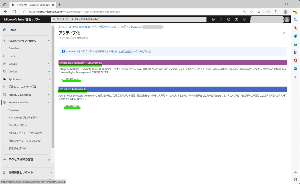 テナント間アクセス設定で信頼設定を構成し、選択したユーザー、グループ、アプリケーションをターゲットとするには、Azure AD Premium が必要です。