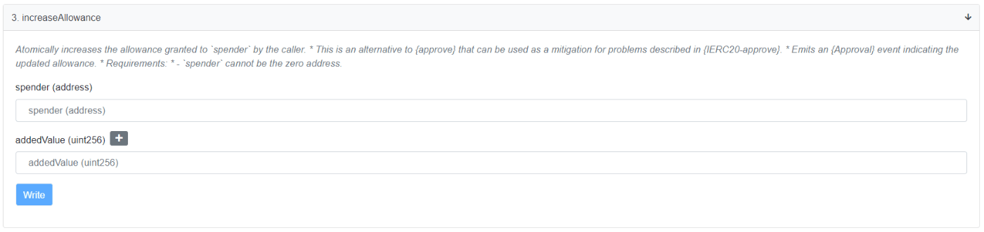 function increaseAllowance(address spender, uint256 addedValue) public virtual returns (bool) {