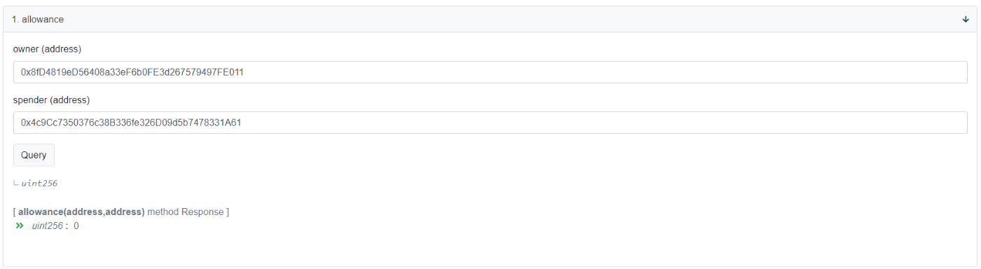 後に出てくるapproveでowner(token所持者)からspender(token受取者)に対に何枚のtoken送付許可を与えているかを確認する