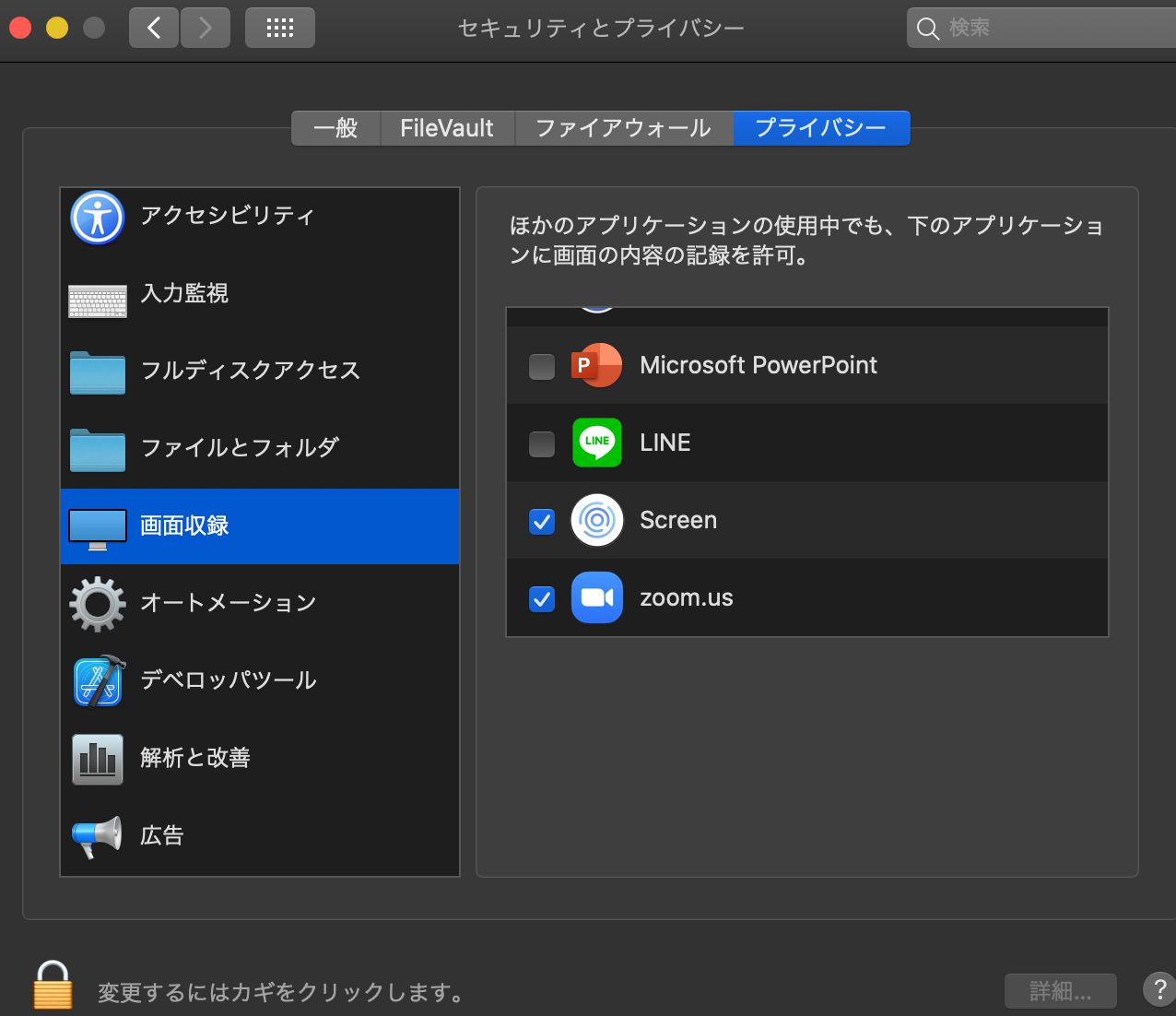 - 画面収録を選択して鍵をクリック