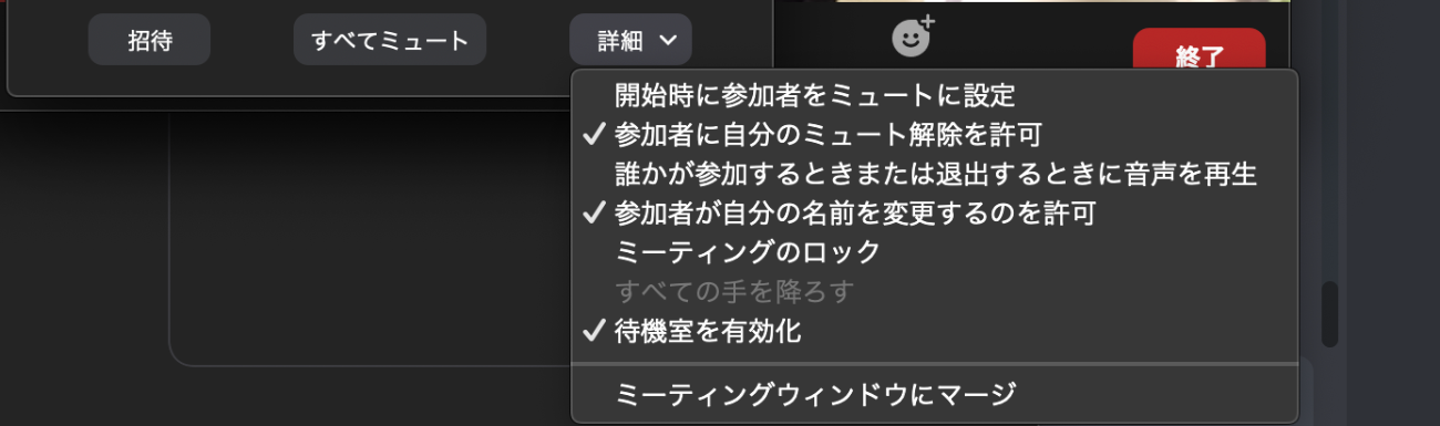 参加者の右下の詳細から様々な設定ができ