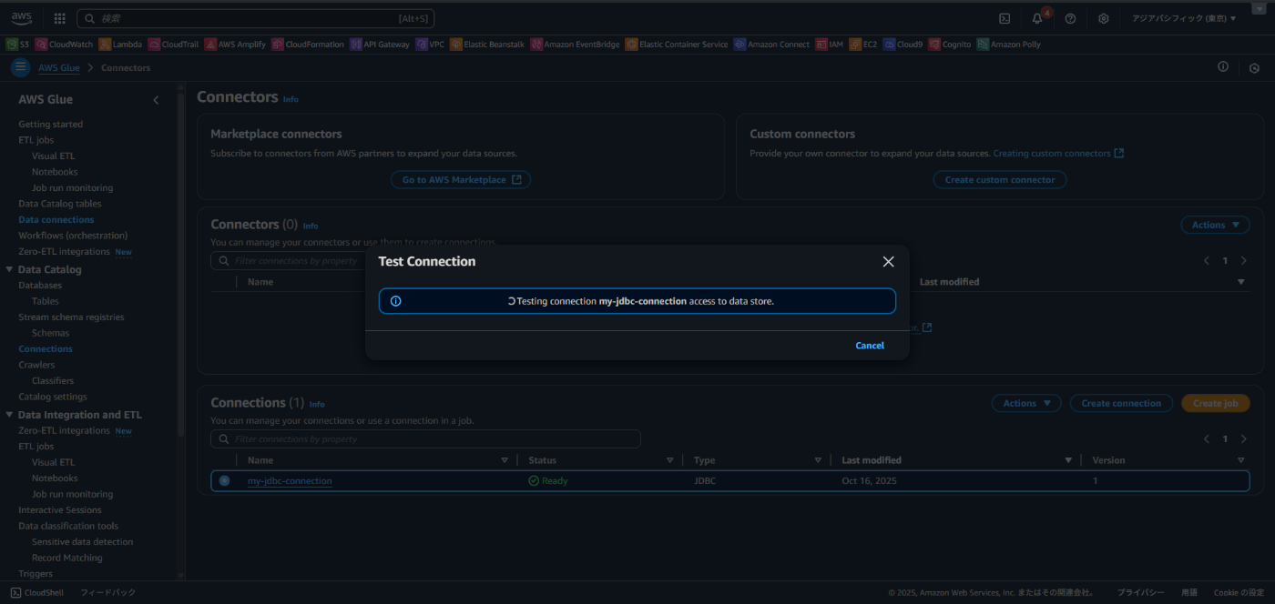 CloudFormation からのデプロイ完了後に Glue コンソールから Test Connection を実行しても InvalidInputException は発生しませんでした。