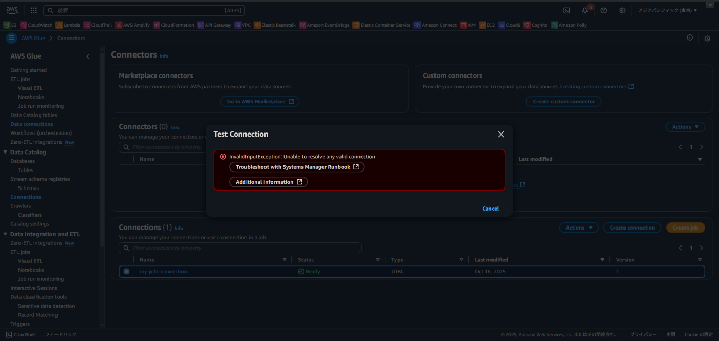 CloudFormation からのデプロイ完了後に Glue コンソールから Test Connection を実行しましたが、InvalidInputException が発生しました。