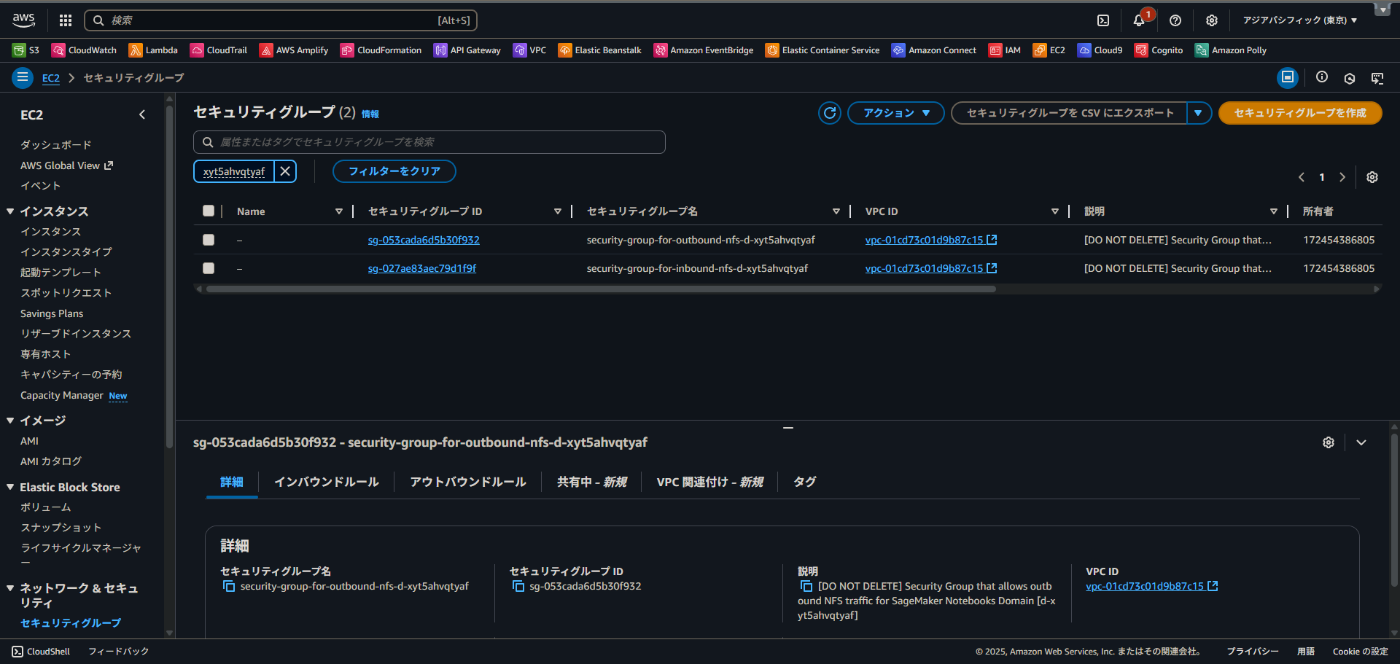 また、EFS ファイルシステムに紐づく 2 つのセキュリティグループも自動作成されます。