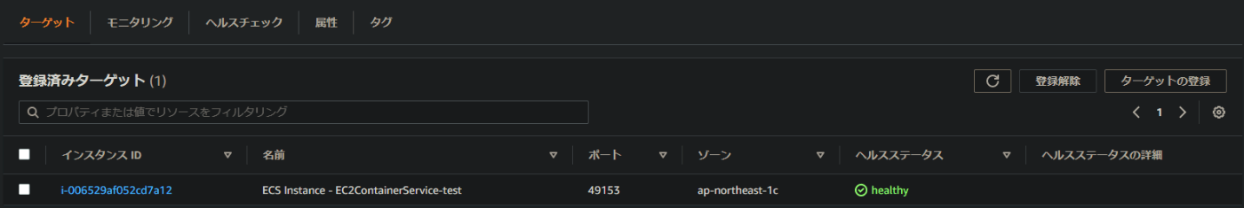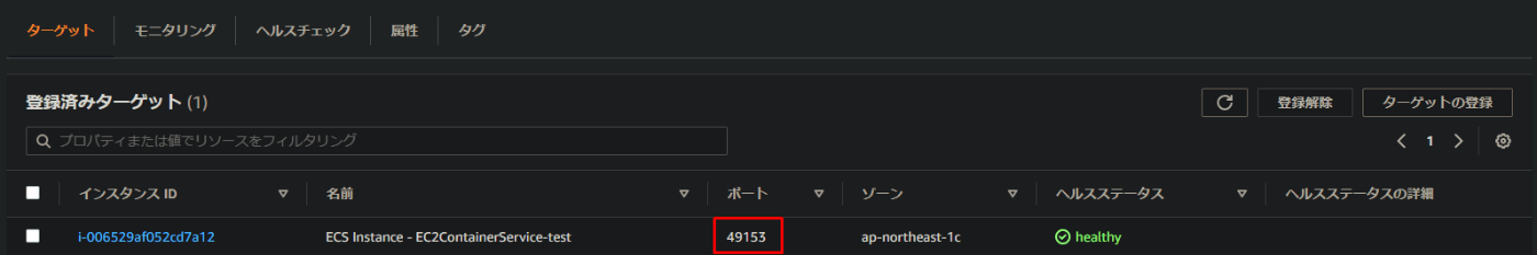 ターゲットグループには動的ポートマッピングを使用して起動されたタスクのポートへヘルスチェックをしています。