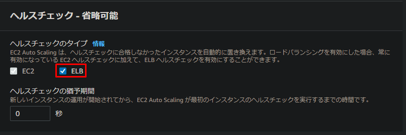 ただし、ヘルスチェックのタイプとして ELB を使用するには、Auto Scaling グループに ALB をアタッチする必要があります。