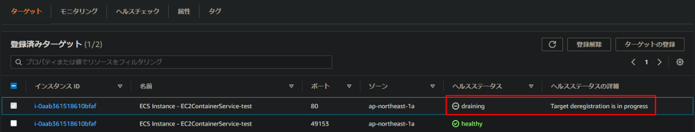 注意点として、80 番ポートへのヘルスチェックの失敗が Auto Scaling グループに伝番される前に登録解除しないと、EC2 インスタンスの置き換えが発生します。