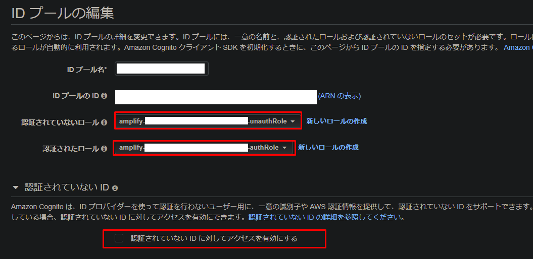 IDプールの編集画面で、「認証されたロール 」と「認証されていないロール」のIAMロール名を確認できます。