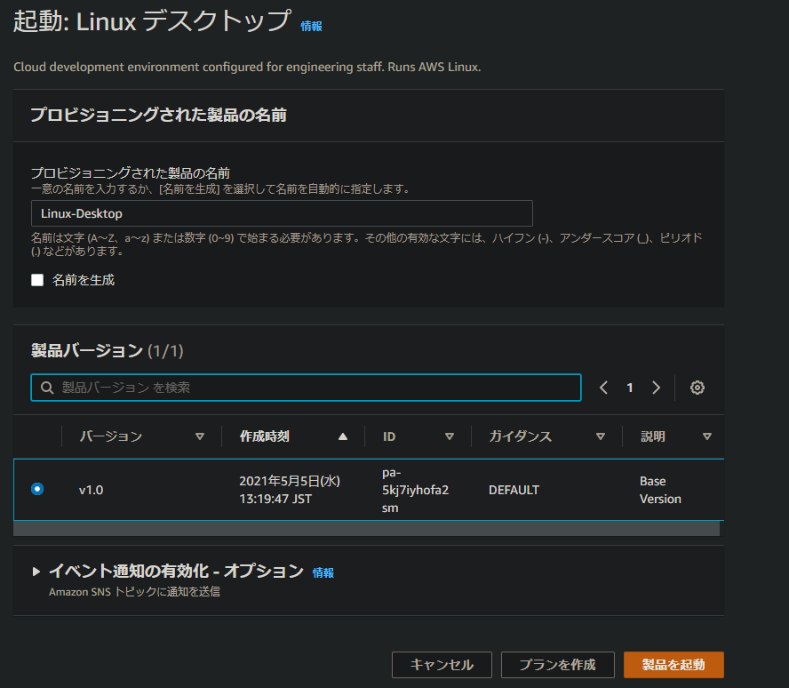 細かく指定するのが面倒だったので、今回は作成したlinuxDesktopLaunchRoleにAdministratorAccessを付与し、このロールを起動制約で指定しました。