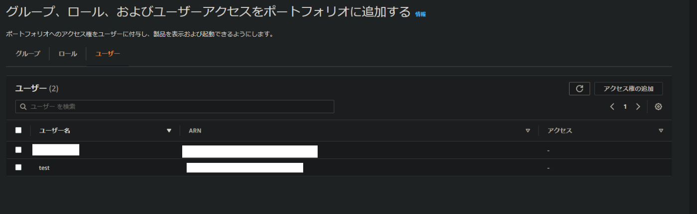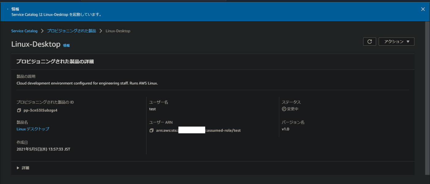 AWSServiceCatalogEndUserFullAccess権限のみを付与したtestというスイッチロール用のIAMロールを指定しました。