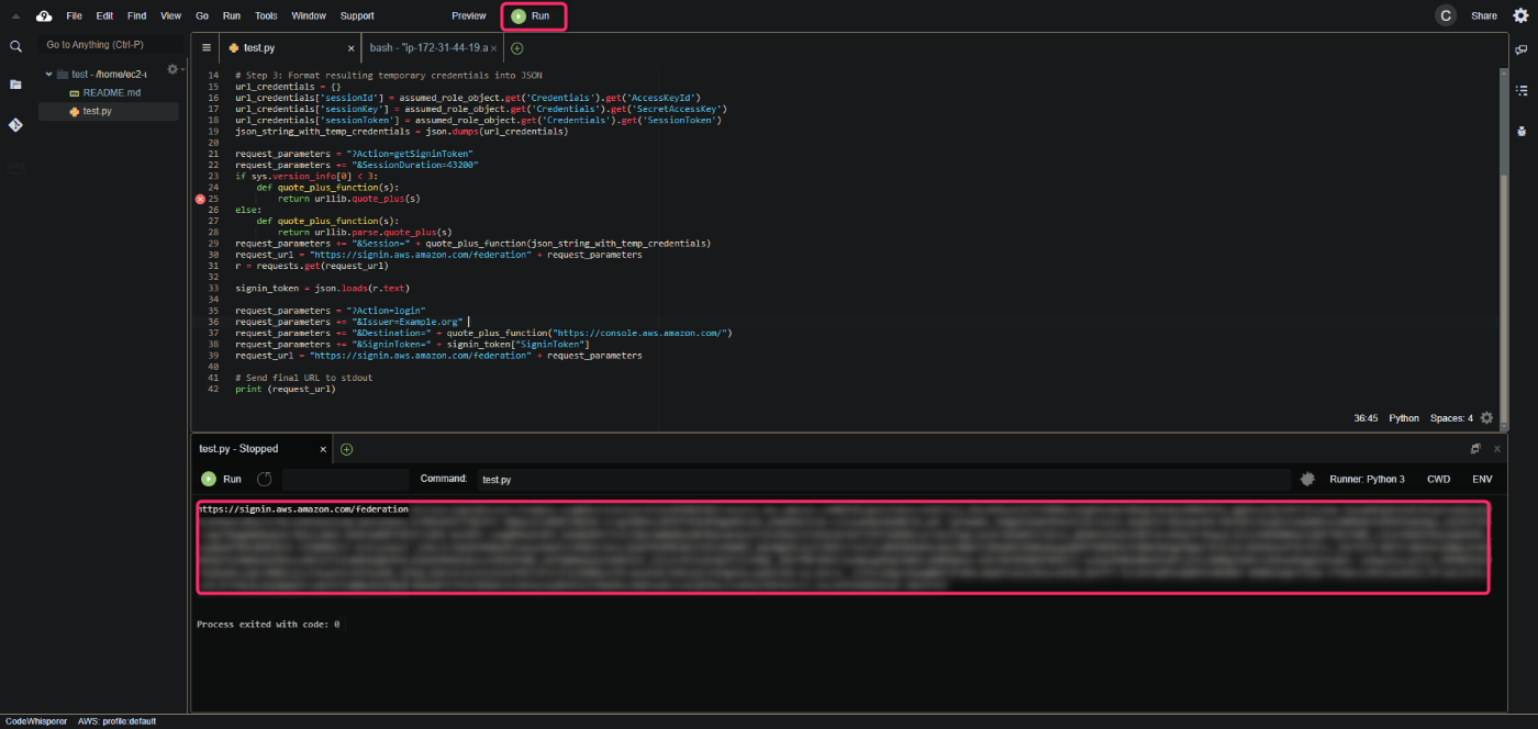 # Step 4. Make request to AWS federation endpoint to get sign-in token. Construct the parameter string with