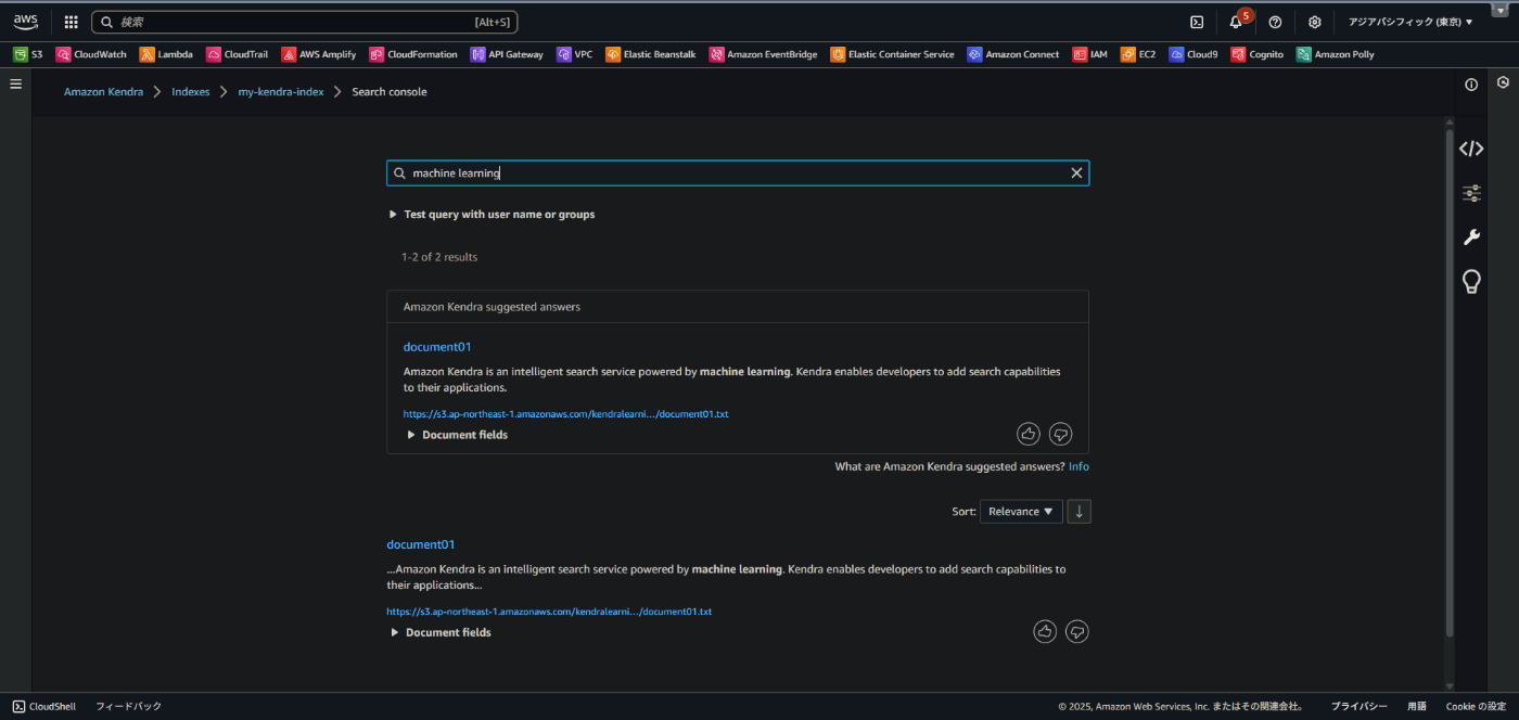 $ aws kendra query --index-id your-index-id --query-text "machine learning"