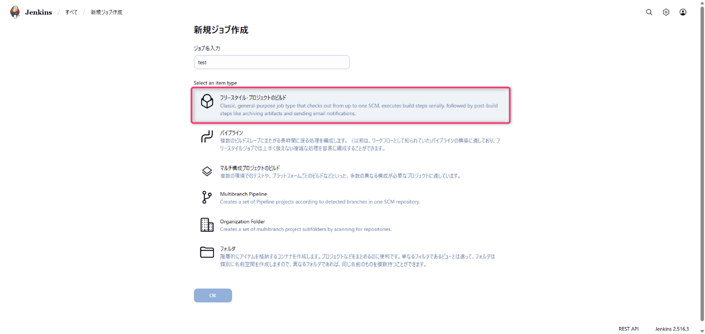 ジョブ名を入力して「フリースタイル・プロジェクトのビルド」を選択します。