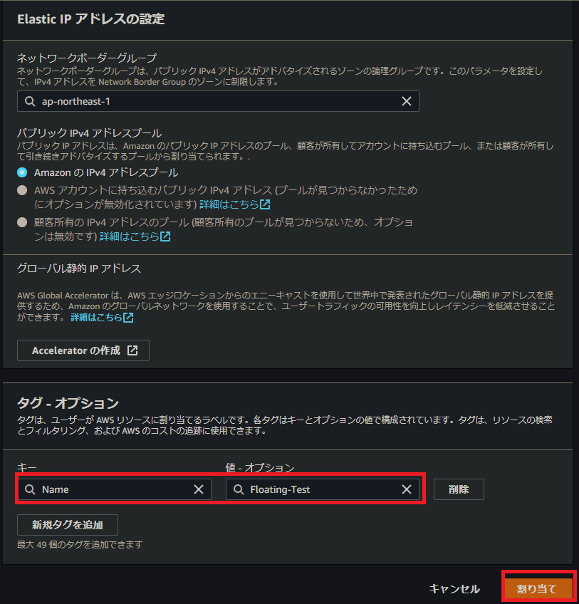 タグに Floating-Test と付けて、あとはデフォルトのまま割り当てをクリックします。