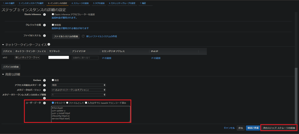 インスタンスの詳細は以下のように設定しました。