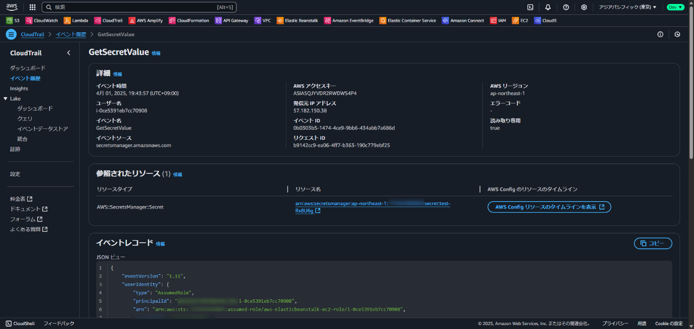 デプロイ後に CloudTrail を確認したところ、EC2 インスタンスから GetSecretValue が実行されている記録がありました。