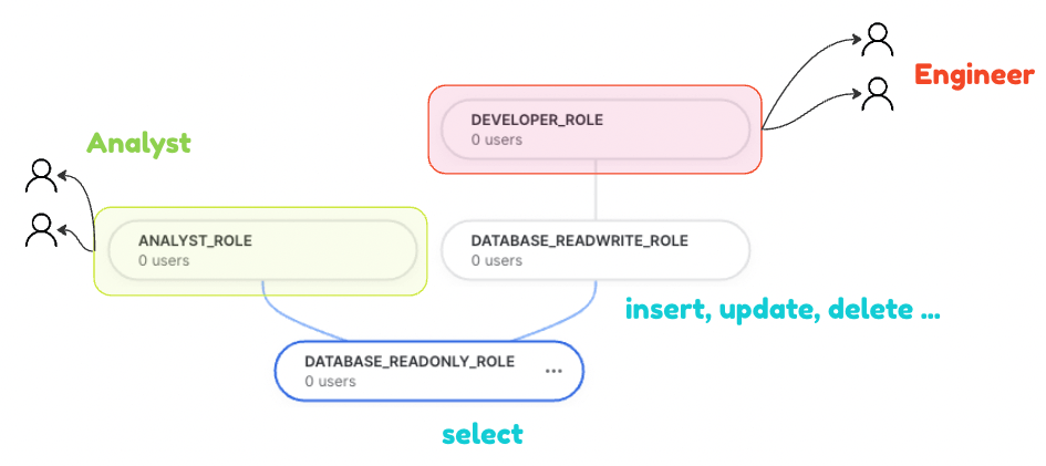 「developer_role」をエンジニア用、「analyst_role」をアナリスト用のユーザグループ的に使用しています。何十人もいるエンジニアやアナリストに一括で権限付与を変更したい場合に、ユーザグループロールの権限を変更するだけで良いため、シンプルになります。