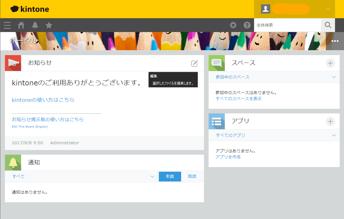 トップページ(「ポータル」と呼ばれます)が表示されます。「アプリ」グループの「+」ボタンをクリックすることで、アプリを新規作成できます。